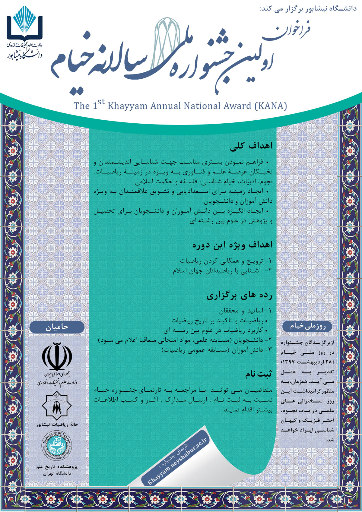 قابل توجه اساتید، همکاران و دانشجومعلمان پردیس بنت الهدی صدر سنندج: دانشگاه نیشابور متولی برگزاری جشنواره ملی سالانه خیام در سه رده اساتید ومحققان، دانشجویان ودانش آموزان می باشد .