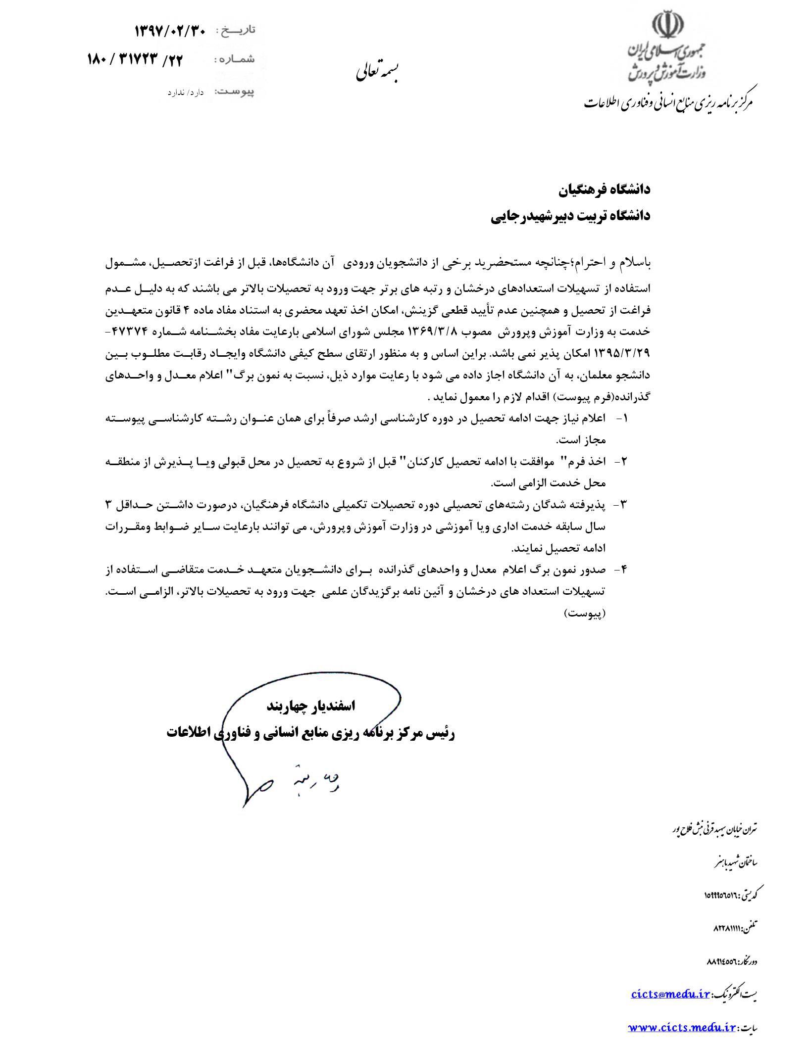 مجوز مرکز برنامه ریزی در خصوص ادامه تحصیل دانشجویان نمونه و استعدادهای برتر