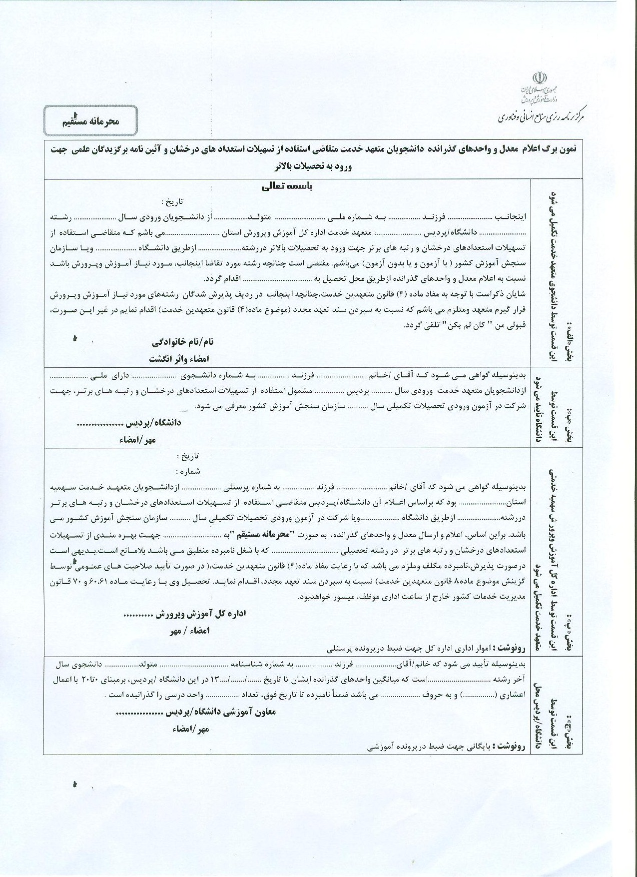 دانشجویان نفرات برتر برای تکمیل فرم نمون برگ اعلام معدل وواحدهای گذرانده دانشجویان متعهدخدمت متقاضی استفاده ازتسهیلات استعدادهای درخشان وآئین نامه برگزیدگان علمی جهت ورود به تحصیلات بالاتر برای تکمیل فرم به آموزش مراجعه نمایند.