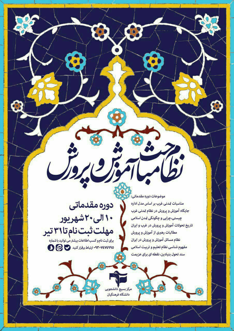 دوره نظام مباحث آموزش وپرورش ویژه دانشجو معلمان از طرف بسیج دانشجویی دانشگاه فرهنگیان برگزار می گردد.