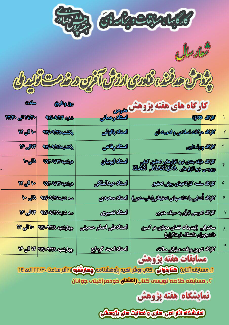 -اطلاع رسانی با ارائه فرم از طریق ایمیل جهت استعلام برگزاری کارگاهها و سخنرانی ها توسط اساتید در هفته پژوهش که 8 کارگاه و یک سخنرانی پیشنهادی در جلسه ستاد بزرگداشت هفته پژوهش مورد تایید قرار گرفت.