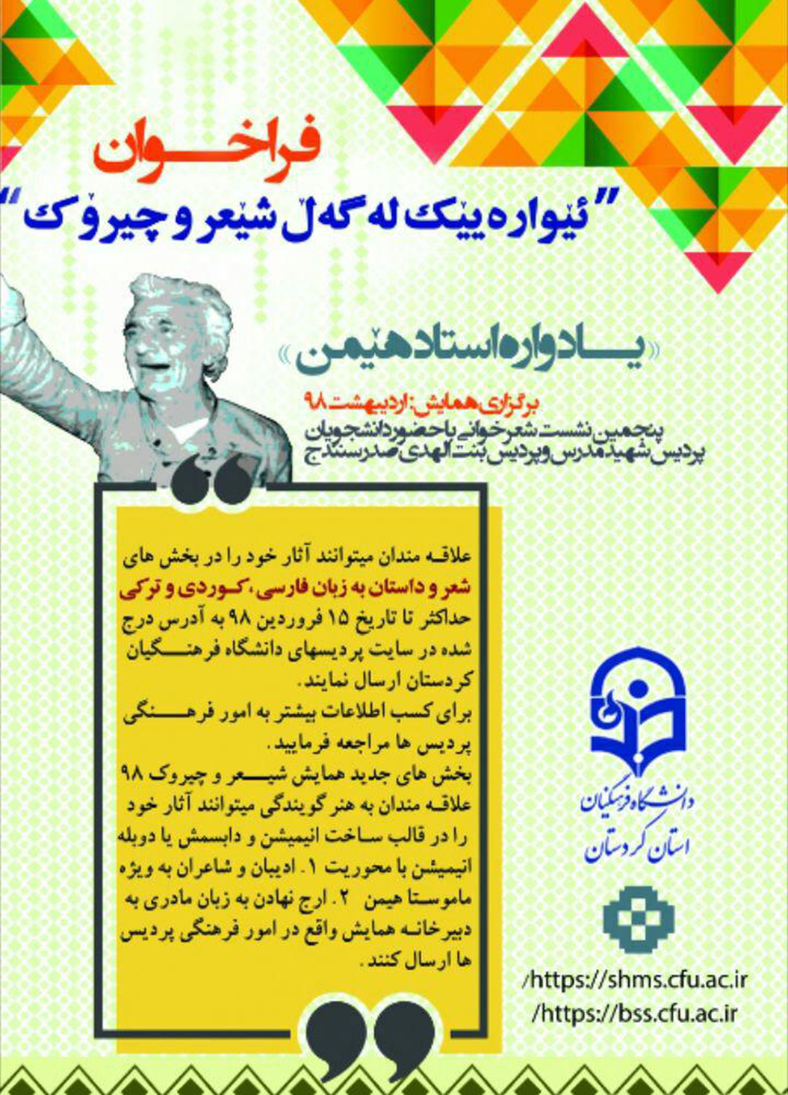 علاقه مندان می توانند آثار خود را در بخش های "شعر و داستان به زبان های فارسی و کردی و ترکی" حداکثر تا ۱۵ فروردین ۹۸ به آدرس های درج شده در سایت پردیس های دانشگاه فرهنگیان استان کردستان ارسال نمیاند.