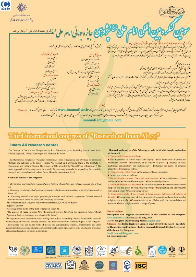 سومین کنگره بین المللی امام علی(ع) پژوهی بامعرفی جایزه جهانی امام علی علیه السلام در تاریخ ۱ شهریور ۱۳۹۸ توسط مرکز تحقیقات امام علی علیه السلام و تحت حمایت سیویلیکا در شهر تهرانبرگزار خواهد شد.با توجه به اینکه این همایش به صورت رسمی برگزار می گردد، کلیه مقالات این کنفرانس در پایگاه سیویلیکا و نیز کنسرسیوم محتوای ملی نمایه خواهد شد و شما می توانید با اطمینان کامل، مقالات خود را در این همایش ارائه نموده و از امتیازات علمی ارائه مقاله کنفرانس با دریافت گواهی کنفرانس استفاده نمایید.