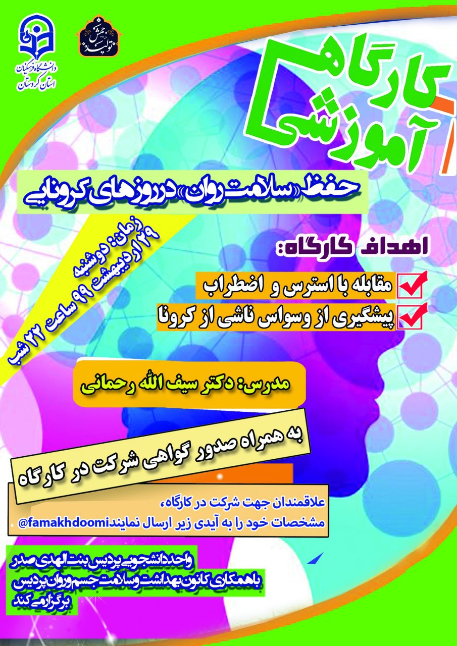 به همت واحد دانشجویی پردیس بنت الهدی صدر کارگاه حفظ « سلامت روان» در روز های کرونایی در فضای مجازی به صورت آنلاین با حضور دکتر سیف الله رحمانی برگزار می گردد.
