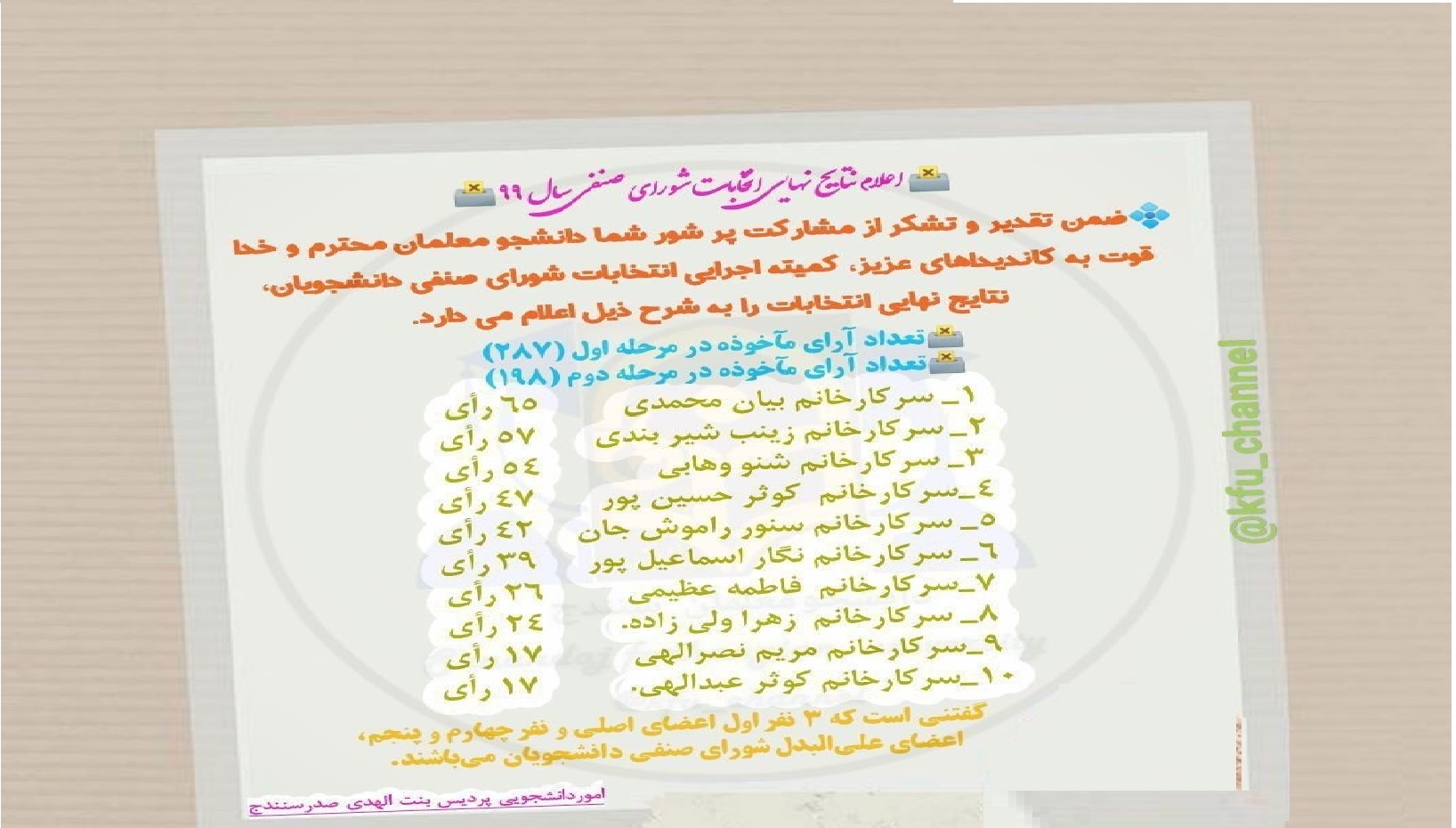 مسئول کمیته اجرایی انتخابات شورای صنفی دانشجویان، ضمن تقدیر و تشکر از مشارکت پر شور شما دانشجو معلمان محترم و خدا قوت به کاندیداهای عزیز، نتایج نهایی انتخابات را به شرح ذیل اعلام نمودند.