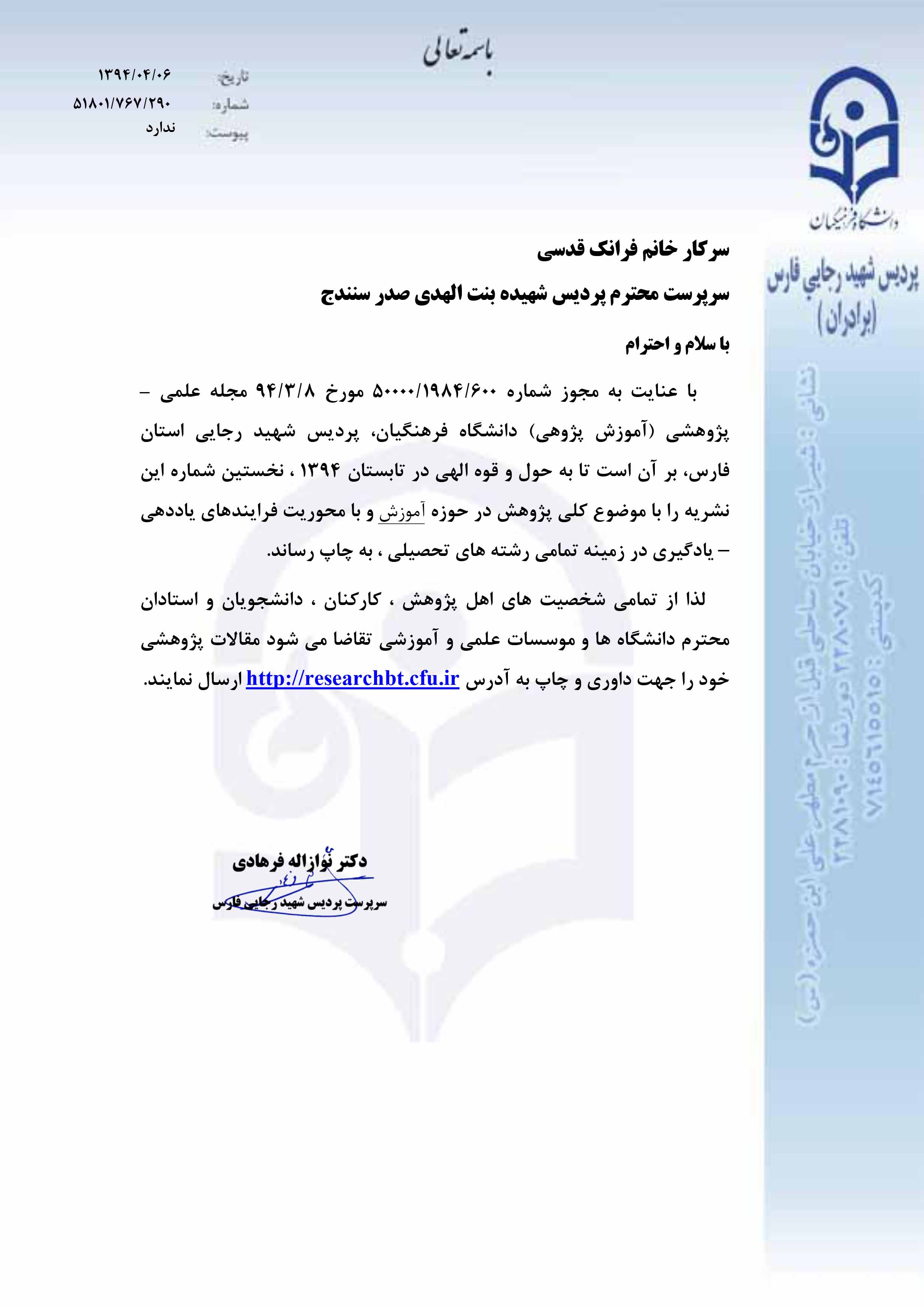 صاحب امتیاز : دانشگاه فرهنگیان - پردیس شهید رجایی فارس
