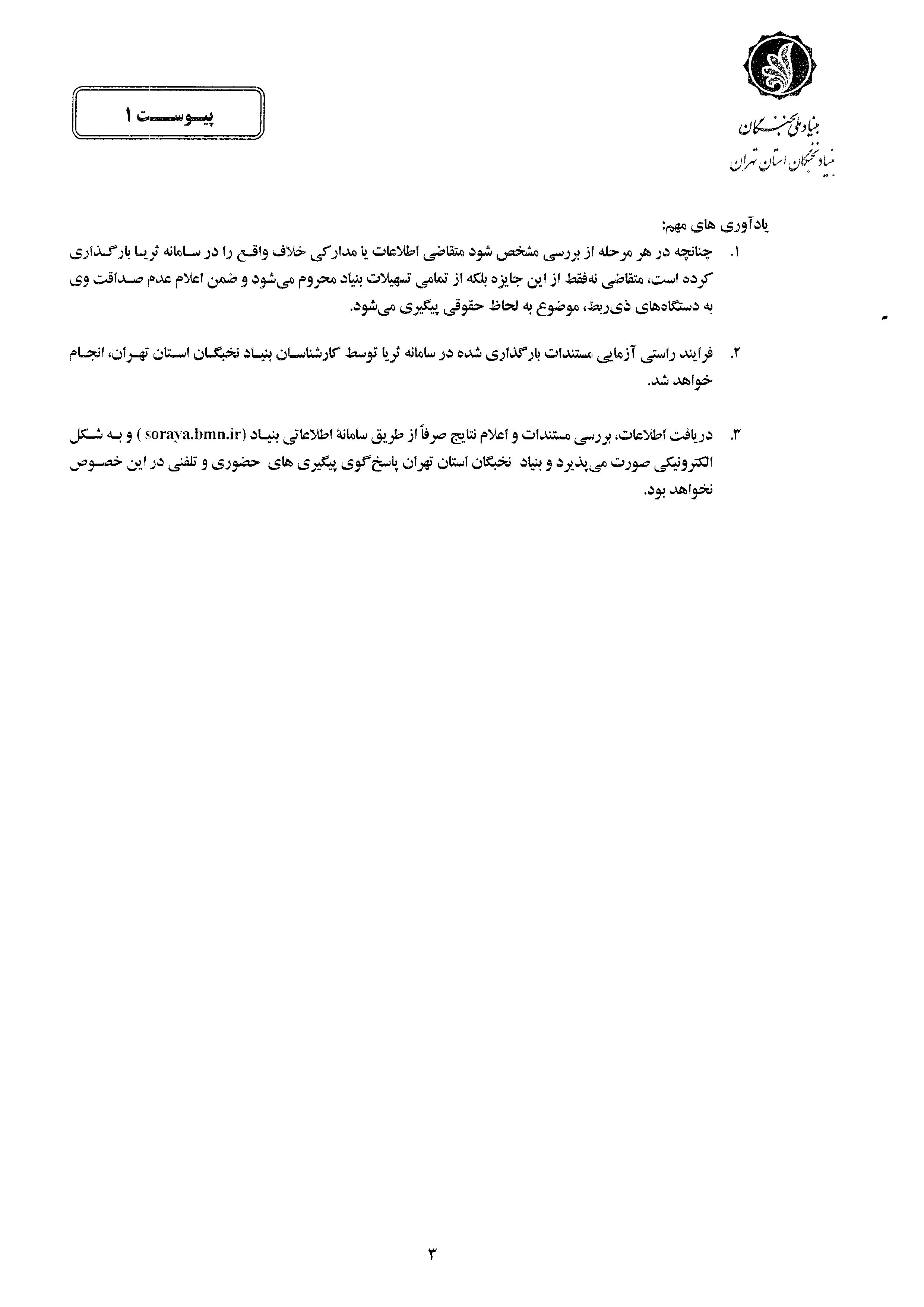همچنین بنیاد ملی نخبگان در این اطلاعیه افزود: با توجه به اینکه روند دریافت اطلاعات، بررسی مستندات و اعلام نتایج صرفا" از طریق سامانه اطلاعاتی بنیاد هر استان به آدرس soraya.bmn.ir و به شکل الکترونیکی صورت می پذیرد. لذا از ارسال هرگونه مدارک به سازمان مرکزی خودداری گردد.