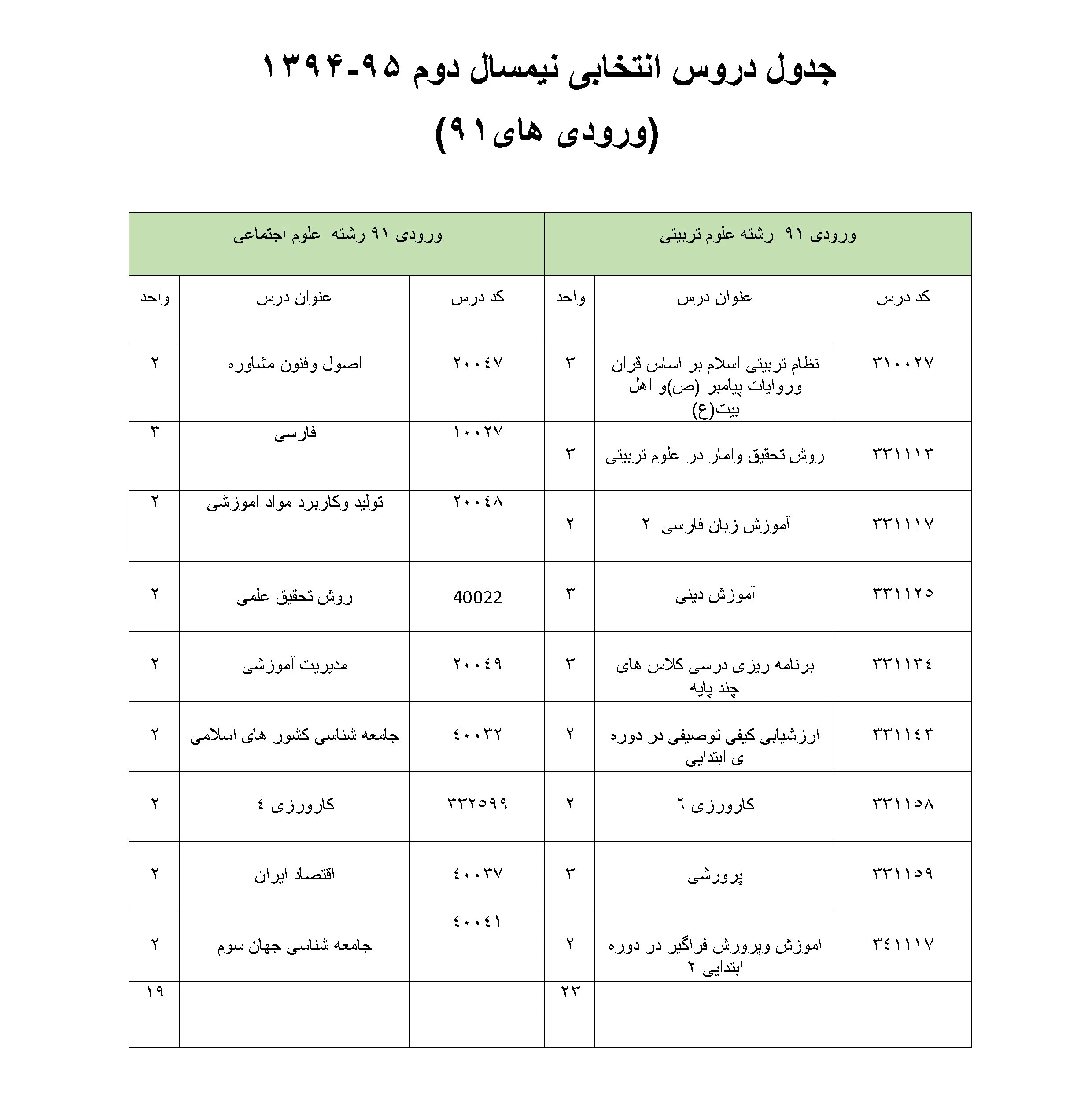 جدول برنامه درسی رشنه های کارشناسی پیوسته