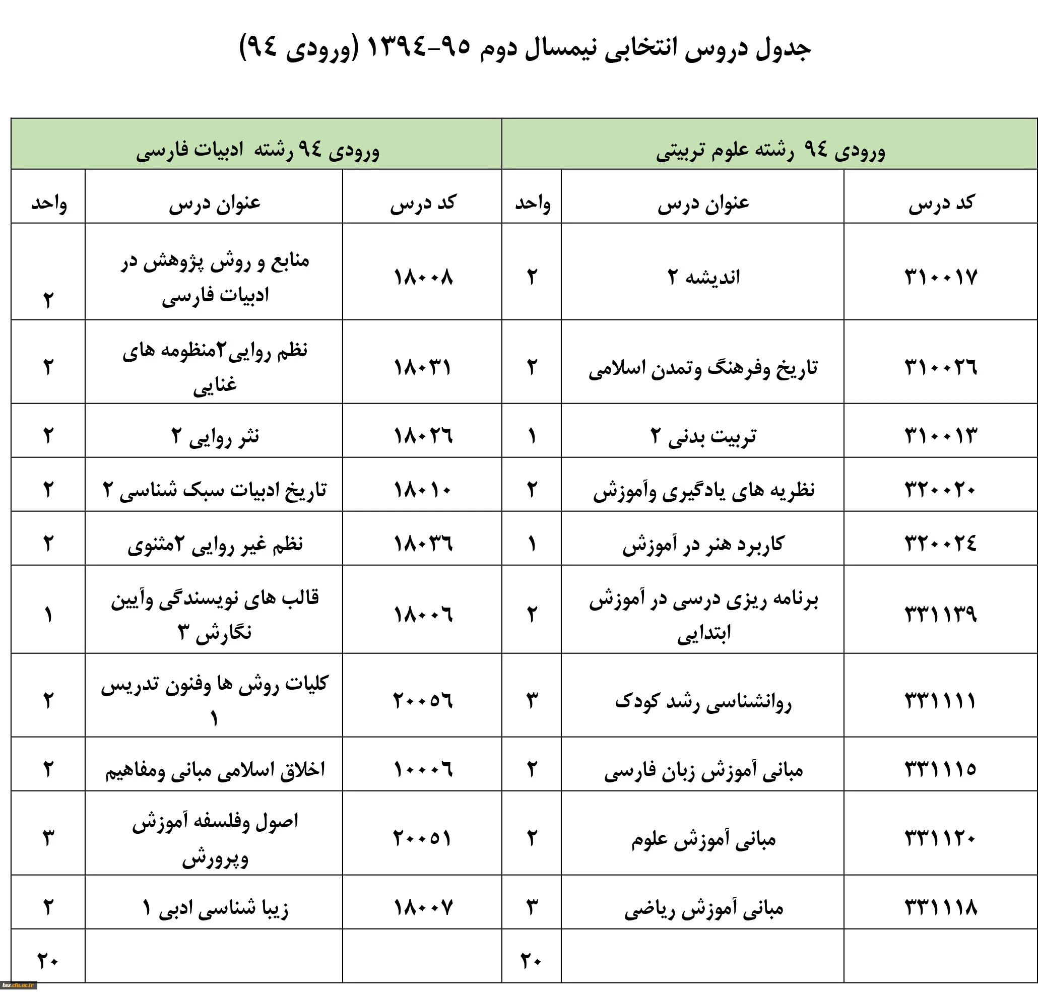 جدول برنامه درسی رشنه های کارشناسی پیوسته