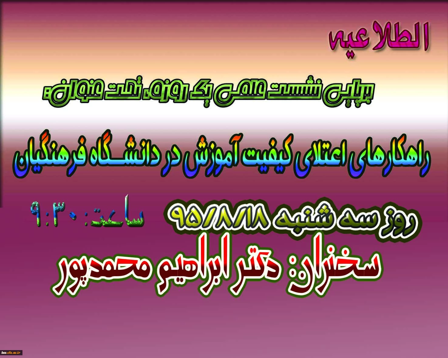 امتیاز دهید : نشست علمی راهکارهای اعتلای کیفیت آموزش در دانشگاه فرهنگیان سهشنبه 18 آبان 1395 ساعت 0:42