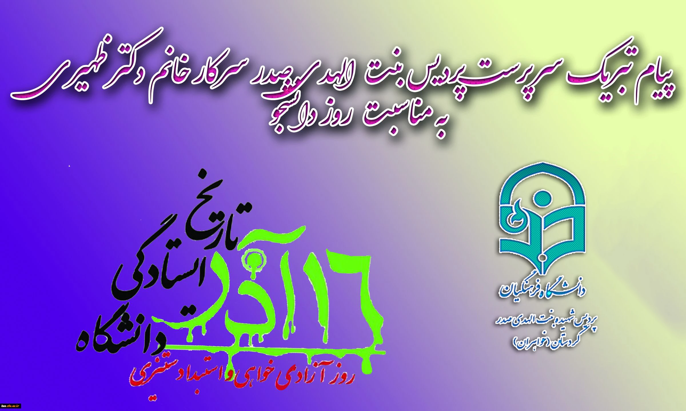 امتیاز دهید : پیام تبریک سرپرست پردیس بنت الهدی صدر سرکار خانم دکتر ظهیری به مناسبت روز دانشجو سهشنبه 16 آذر 1395 ساعت 13:49