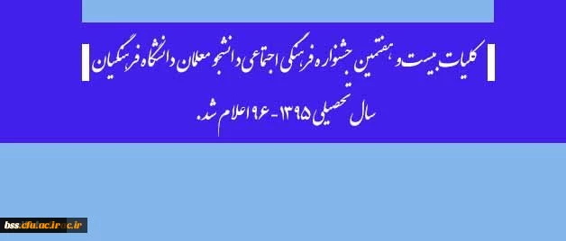 از سوی دبیرخانه دائمی جشنواره های فرهنگی: کلیات بیست و هفتمین جشنواره فرهنگی اجتماعی دانشجو معلمان دانشگاه فرهنگیان سال تحصیلی 1395-96 اعلام شد. 2