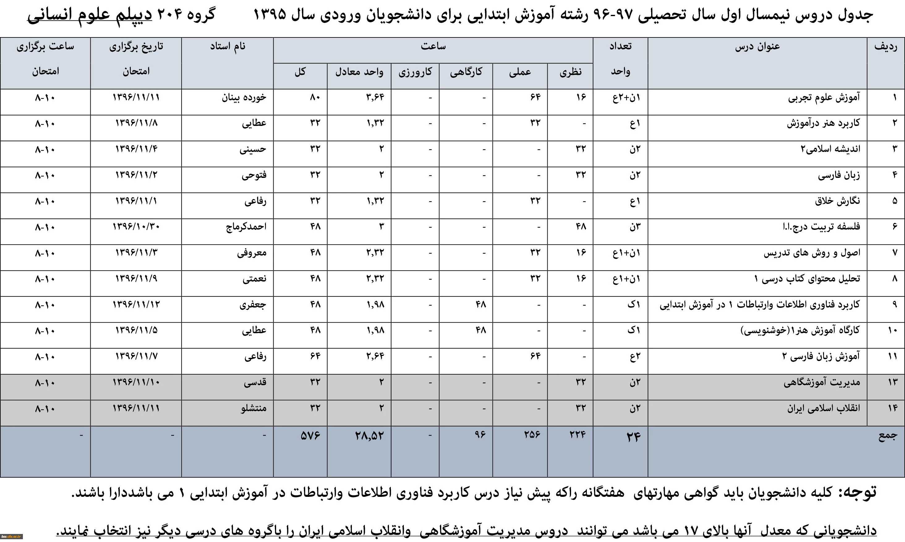 جدول برنامه درسی رشنه های کارشناسی پیوسته