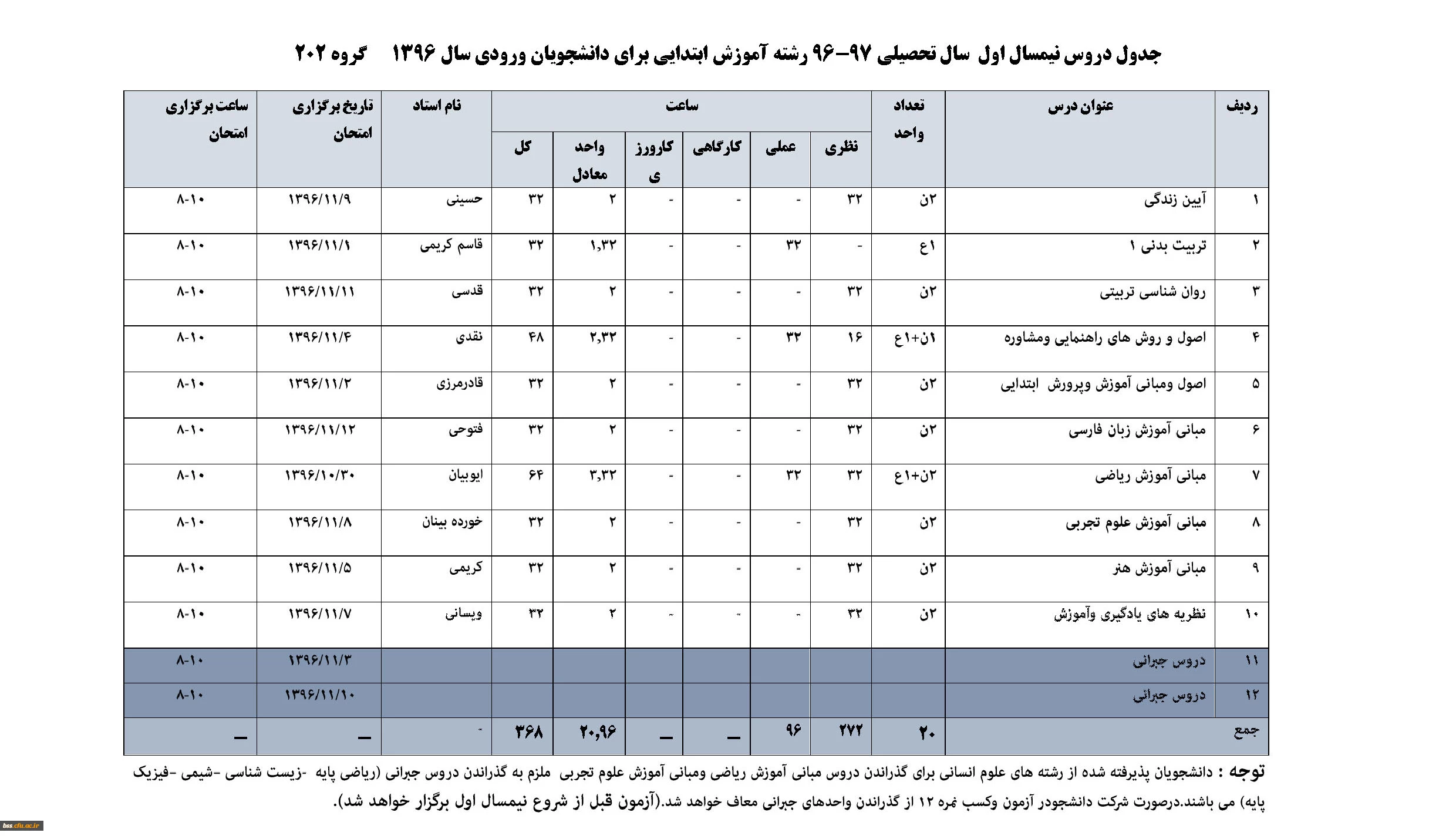 جدول برنامه درسی رشنه های کارشناسی پیوسته