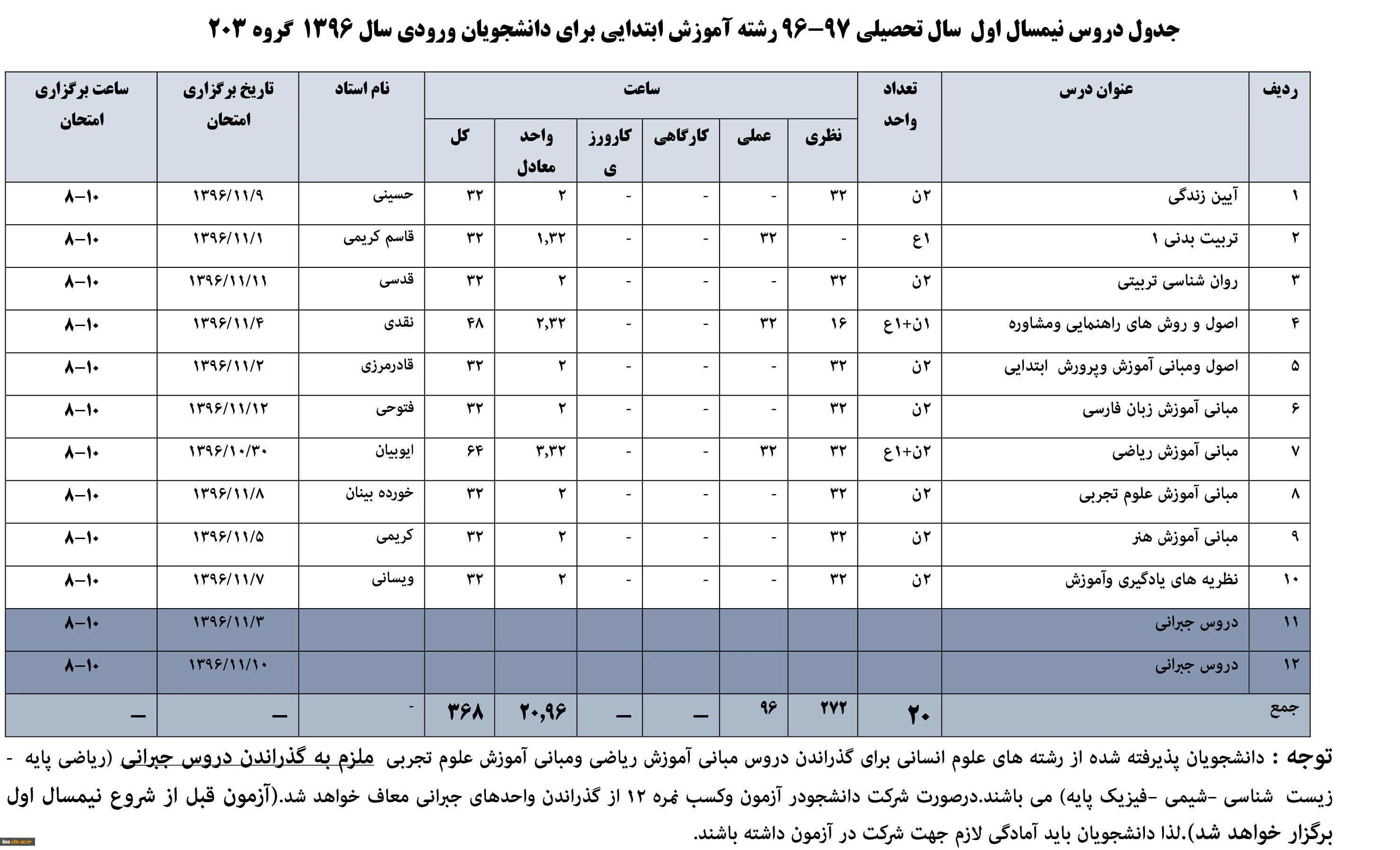 جدول برنامه درسی رشنه های کارشناسی پیوسته