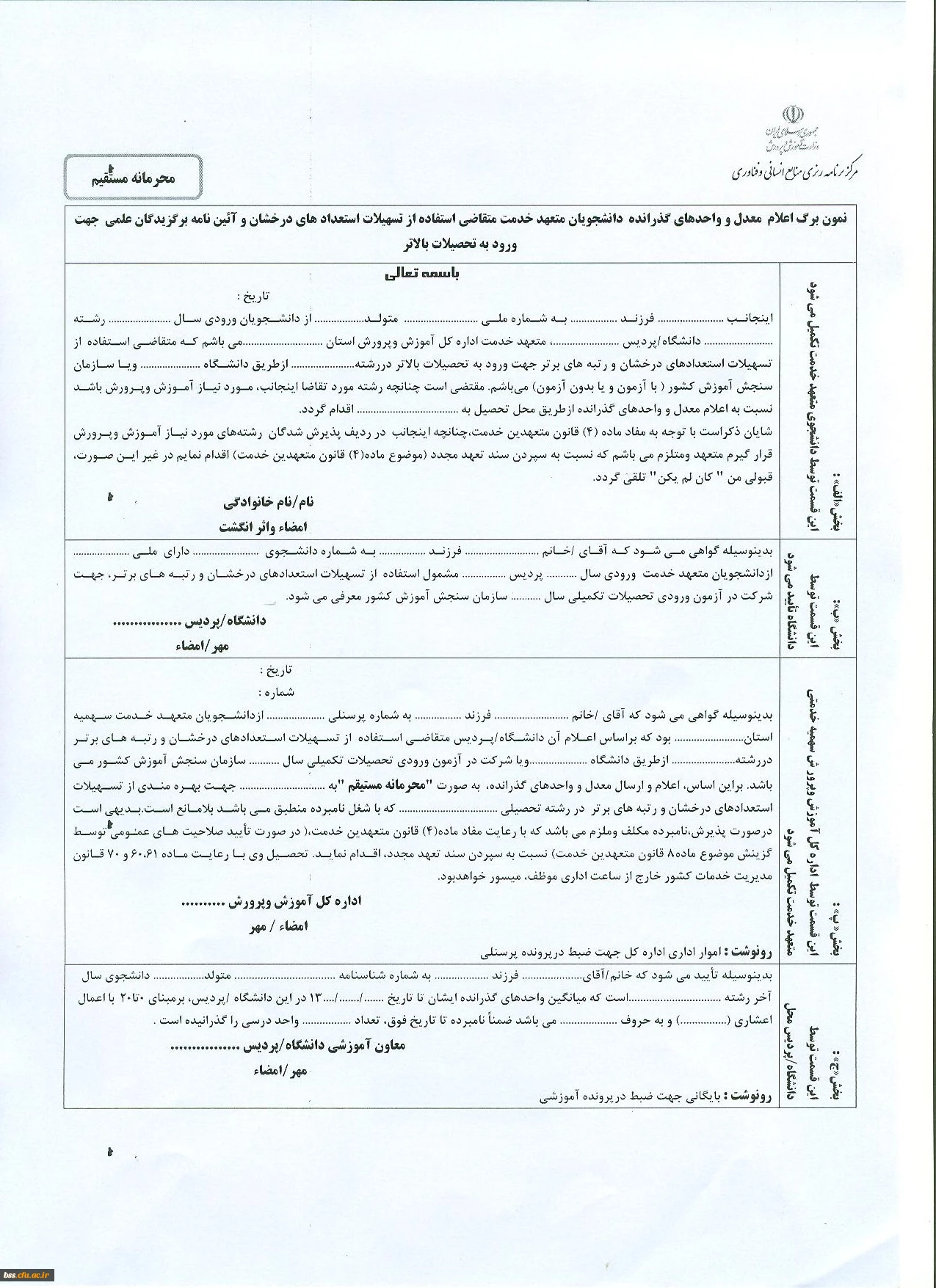 دانشجویان نفرات برتر برای تکمیل فرم نمون برگ اعلام معدل وواحدهای گذرانده دانشجویان متعهدخدمت متقاضی استفاده ازتسهیلات استعدادهای درخشان وآئین نامه برگزیدگان علمی جهت ورود به تحصیلات بالاتر برای تکمیل فرم به آموزش مراجعه نمایند.