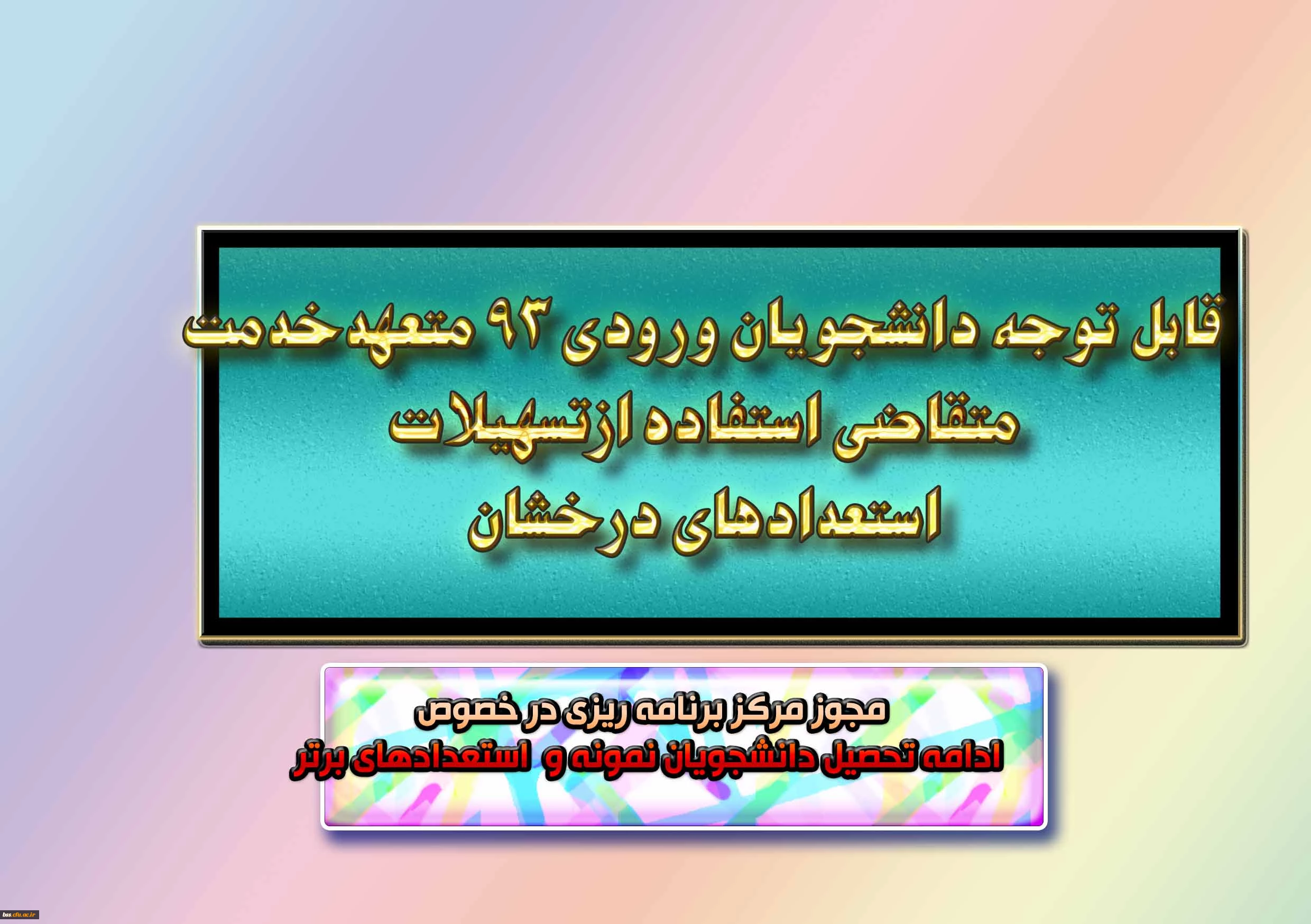 امتیاز دهید : مجوز مرکز برنامه ریزی در خصوص ادامه تحصیل دانشجویان نمونه و استعدادهای برتر دوشنبه 7 خرداد 1397 ساعت 13:35