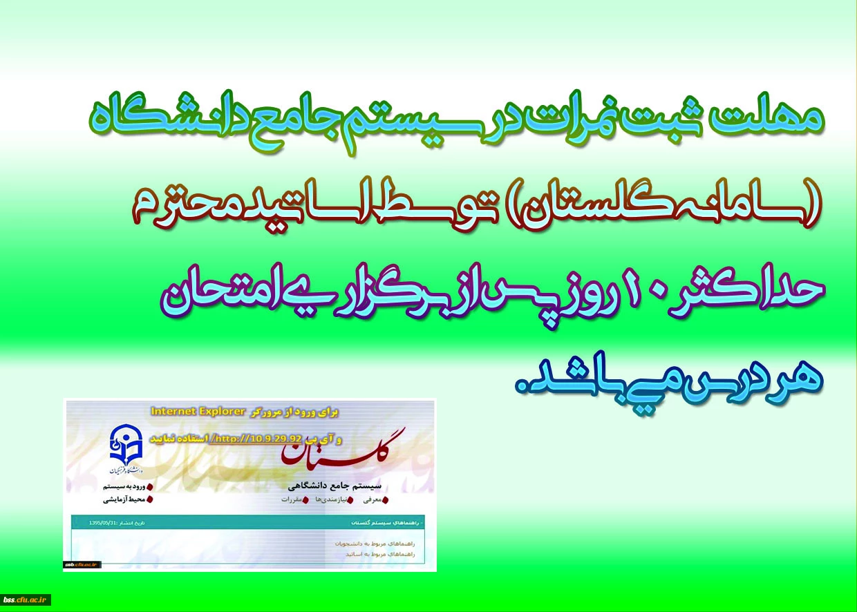 با سلام واحترام به اطلاع می رساند با عنایت به تقویم آموزشی دانشگاه "مهلت ثبت نمرات در سیستم جامع دانشگاه(سامانه گلستان) توسط اساتید محترم حداکثر 10 روز پس از برگزاری امتحان هر درس می باشد . پردیس بنت الهدی صدر