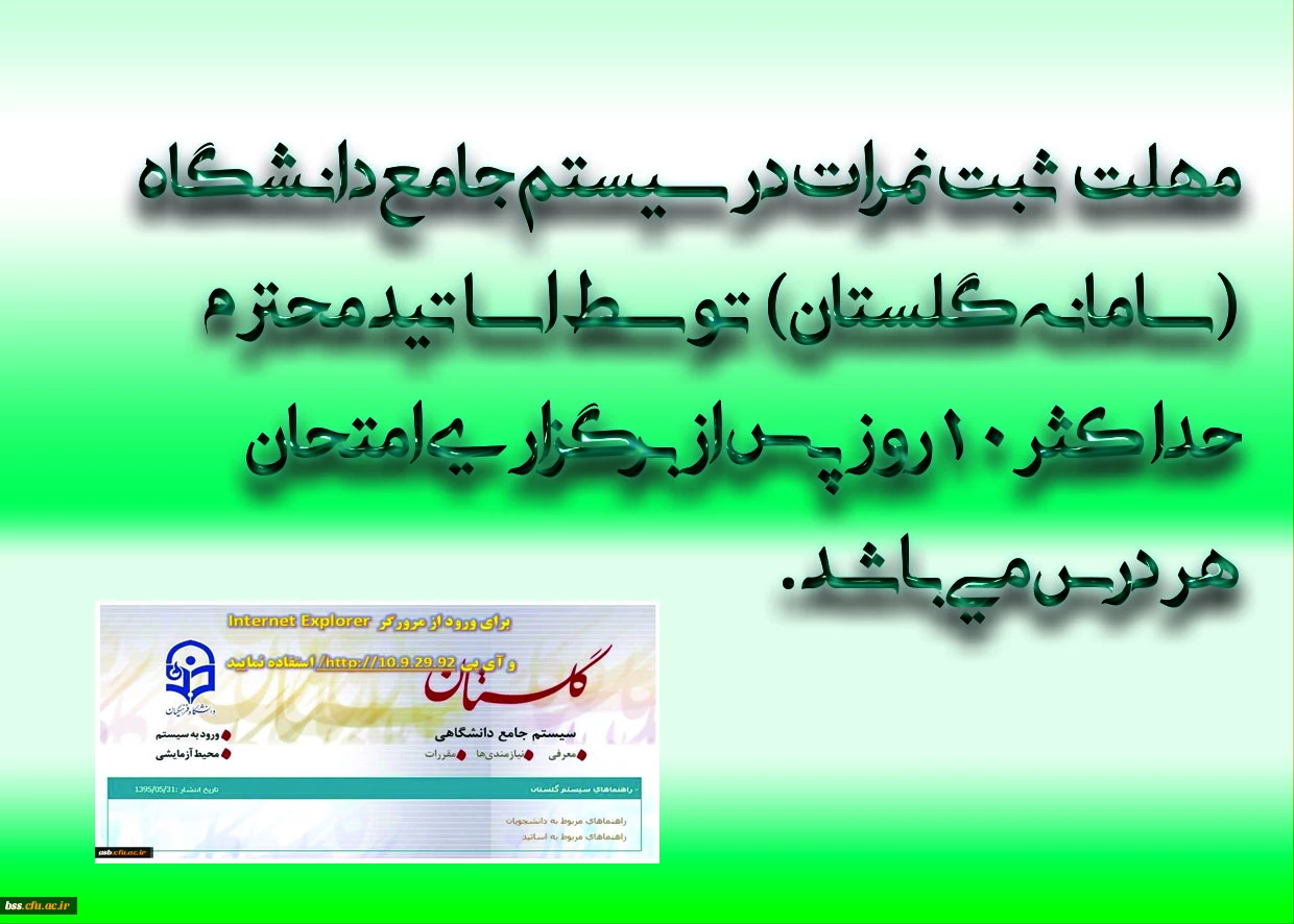 با سلام واحترام به اطلاع می رساند با عنایت به تقویم آموزشی دانشگاه "مهلت ثبت نمرات در سیستم جامع دانشگاه(سامانه گلستان) توسط اساتید محترم حداکثر 10 روز پس از برگزاری امتحان هر درس می باشد . پردیس بنت الهدی صدر
