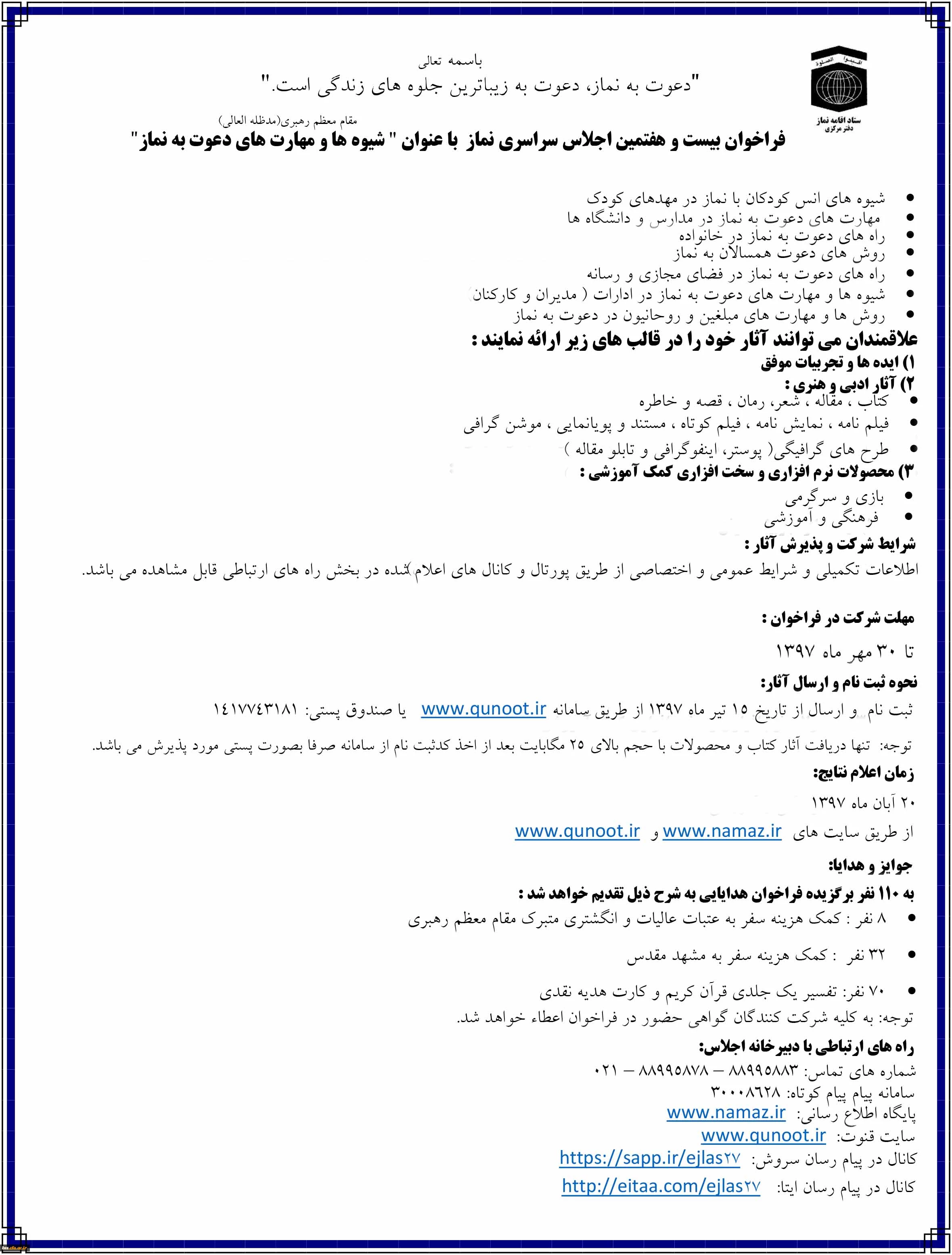 امتیاز دهید : فراخوان بیست و هفتمین اجلاس سراسری نماز با عنوان شیوه ها و مهارت های دعوت به نماز شنبه 23 تیر 1397 ساعت 14:26