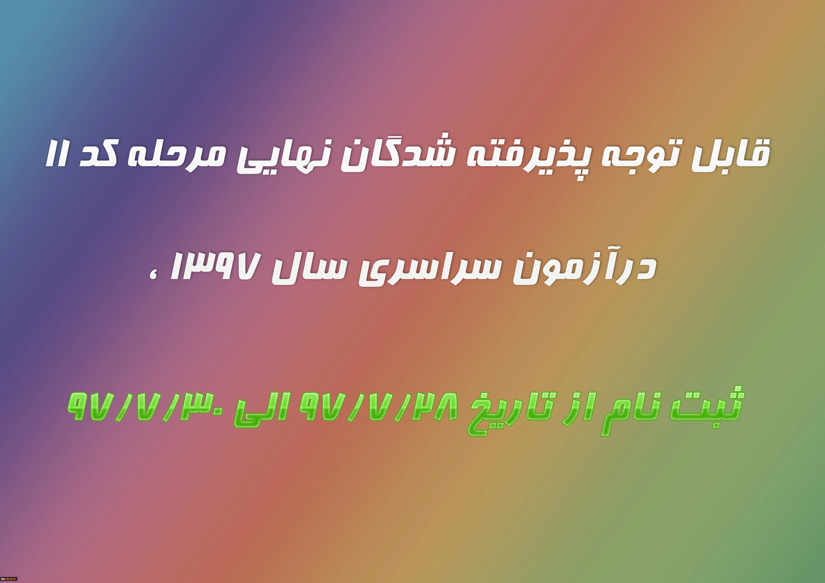 امتیاز دهید : قابل توجه پذیرفته شدگان نهایی مرحله کد 11 درآزمون سراسری سال 1397 ، شنبه 28 مهر 1397 ساعت 12:12