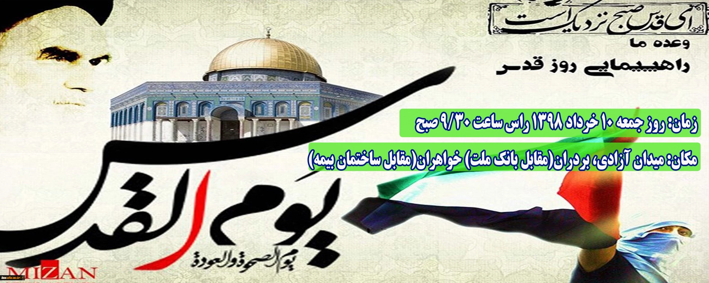 امتیاز دهید : اطلاعیه زمان و مکان تجمع اولیه راهپیمایی روز جهانی قدس 2 سهشنبه 7 خرداد 1398 ساعت 10:12