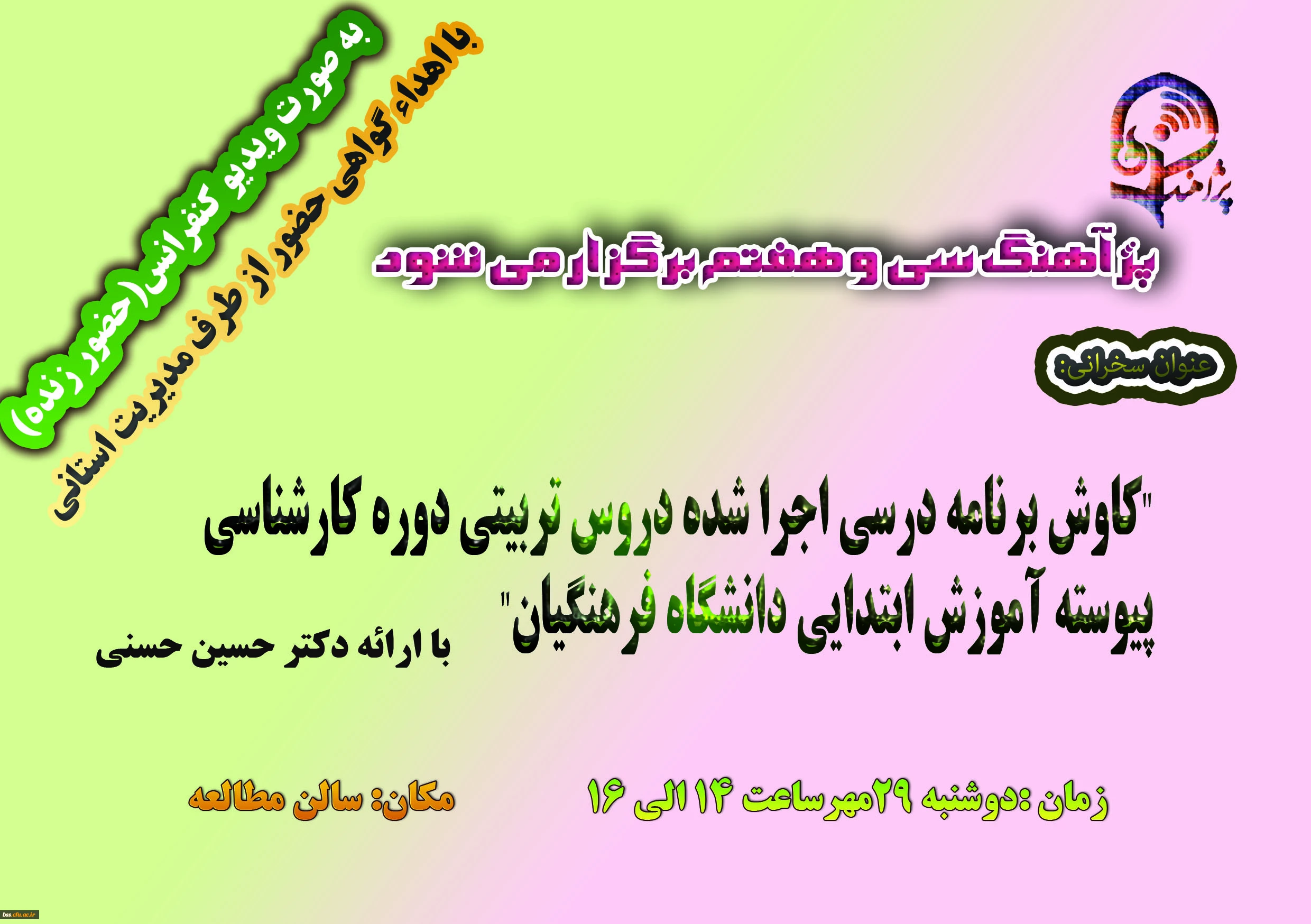 پژآهنگ سی و هفتم برگزار می شود: "کاوش برنامه درسی اجرا شده دروس تربیتی دوره کارشناسی پیوسته آموزش ابتدایی دانشگاه فرهنگیان" با ارائه دکتر حسین حسنی 2
