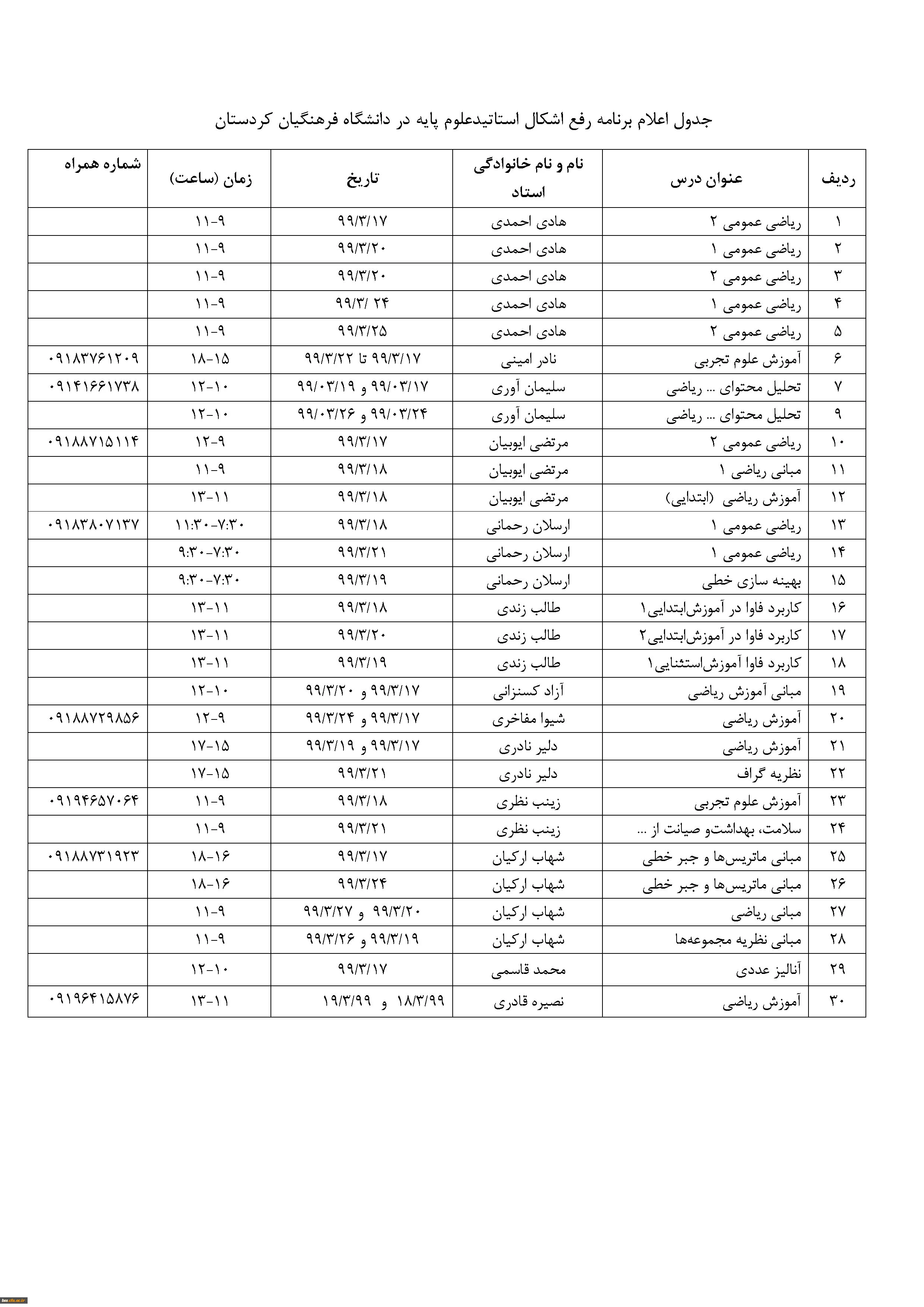 جدول برنامه درسی رشنه های کارشناسی پیوسته